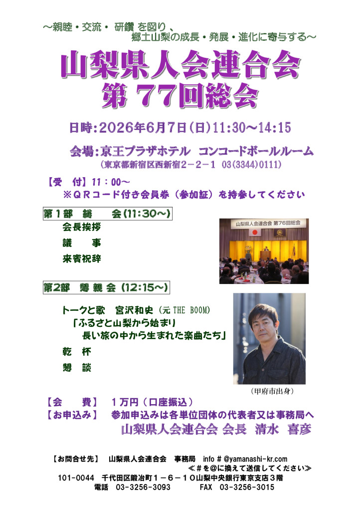 6月7日(日) 山梨県人会連合会 第77回総会開催のお知らせ